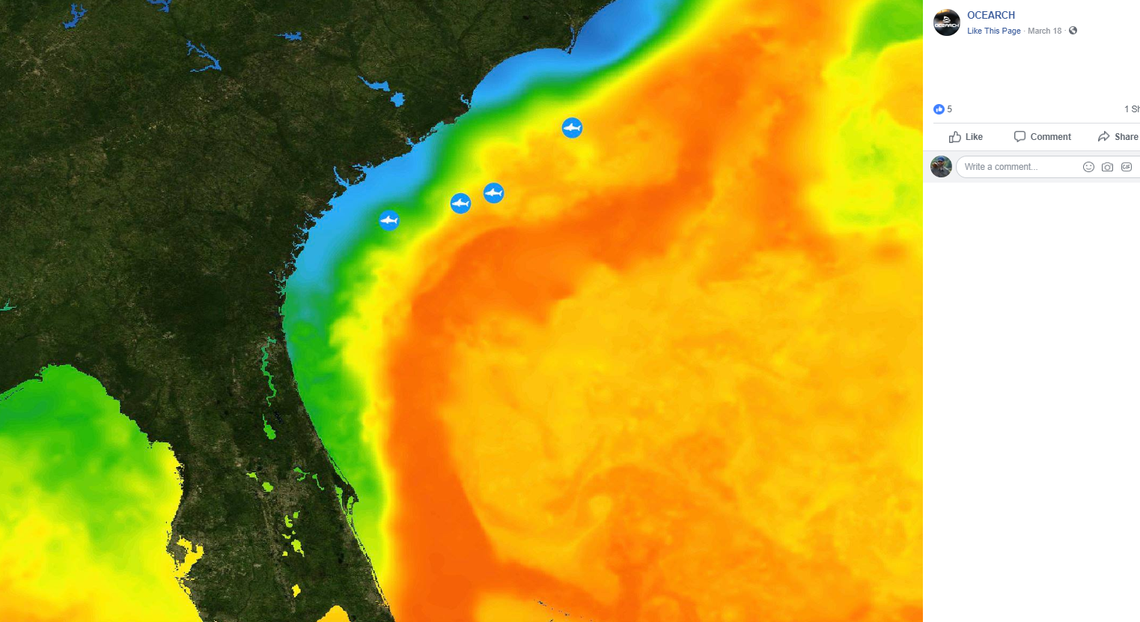 “Check out how many white sharks we are tracking who are taking advantage of all of the upwellings that occur right on the fringe of the Gulf Stream,” said an OCEARCH Facebook post.