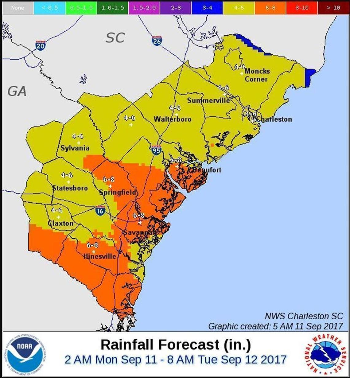 Irma was expected to bring heavy rains — with between six and eight inches anticipated — as it passed through the Lowcountry on Monday, according to Charleston Weather Service meteorologist Blair Holloway. A storm surge of between four and six feet was possible, building to a peak Monday between approximately 1 p.m. and 2 p.m.