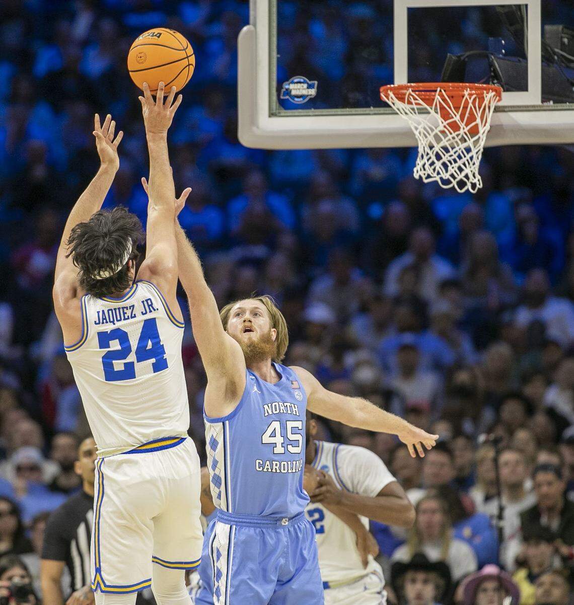 North Carolina’s Brady Manek (45) launches a three-point shot over UCLA’s Johnny Juzang (3) in the first half on Friday, March 25, 2022 during the NCAA East Regional semi-final at Wells Fargo Center in Philadelphia, Pa. Robert Willett rwillett@newsobserver.com