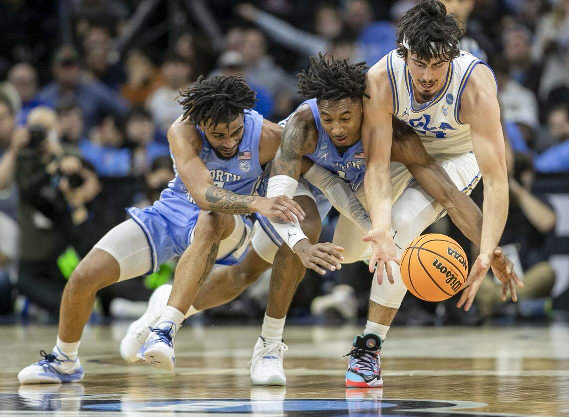 North Carolina’s R.J. Davis (4) and Leaky Black (1) battle with UCLA’s Jaime Jaquez Jr. (24) during the first half on Friday, March 25, 2022 during the NCAA East Regional semi-final at Wells Fargo Center in Philadelphia, Pa.