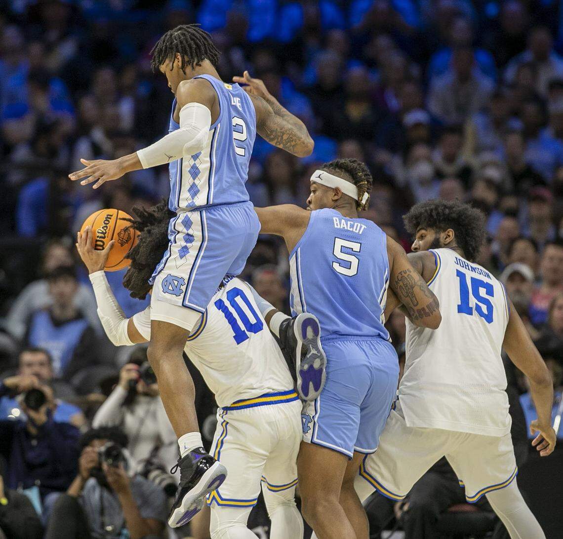 North Carolina’s Caleb Love (2) slashes through UCLA ’s Jules Bernard (1), Jaime Jaquez Jr. (24) and Jaylen Clark (0) for two of his game high 30 points during the second half on Friday, March 25, 2022 during the NCAA East Regional semi-final at Wells Fargo Center in Philadelphia, Pa. Robert Willett rwillett@newsobserver.com